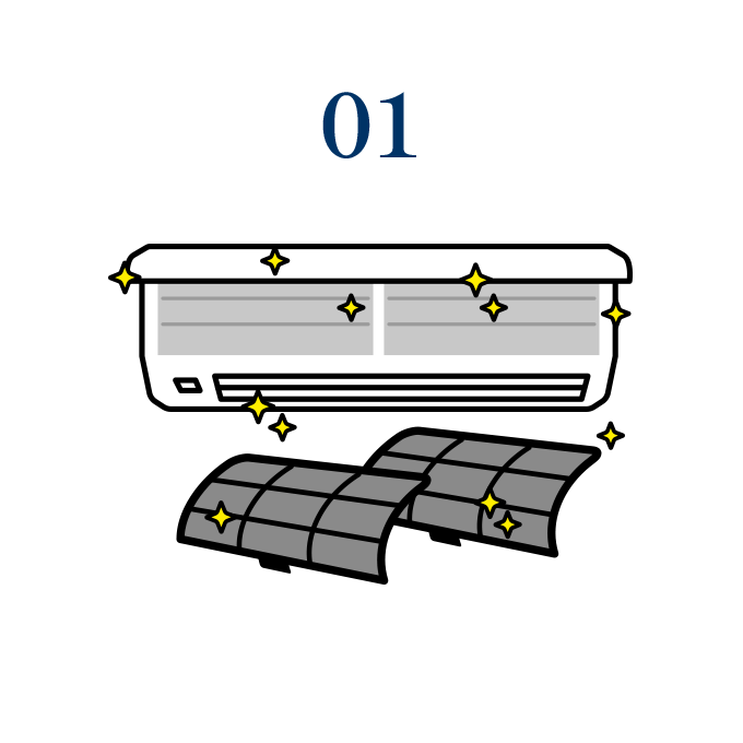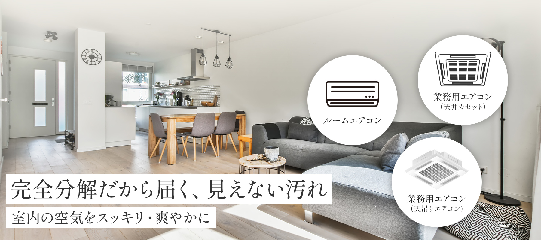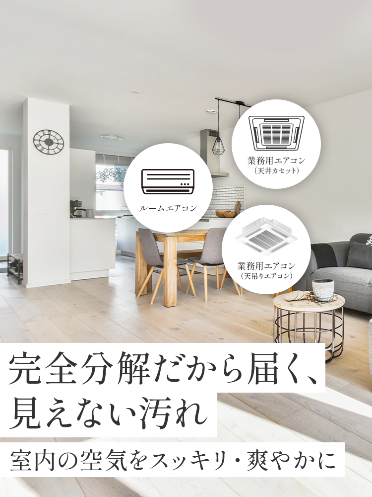 家庭用エアコンから、オフィスや店舗などに設置されている、業務用エアコンまで。衛生的で清潔な空間を維持するために、定期的な清掃をご検討ください。