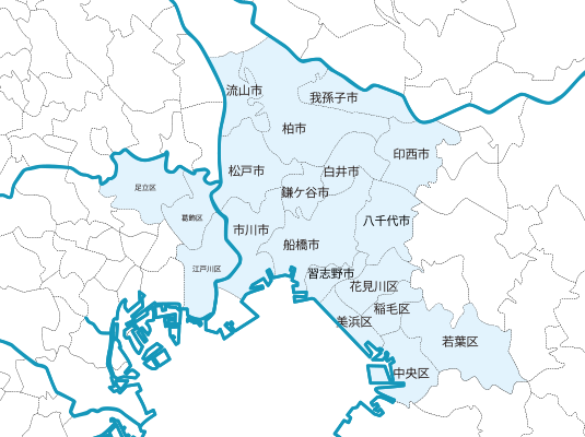 松戸市・柏市・流山市・船橋市・市川市・鎌ケ谷市・白井市・我孫子市・印西市・千葉市(稲毛区・美浜区・中央区・若葉区・花見川区)
